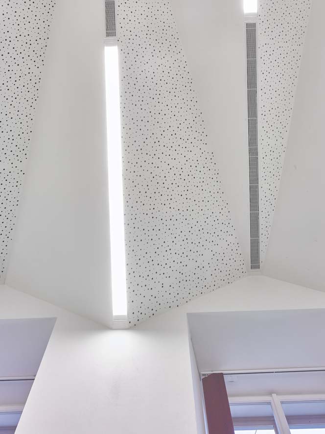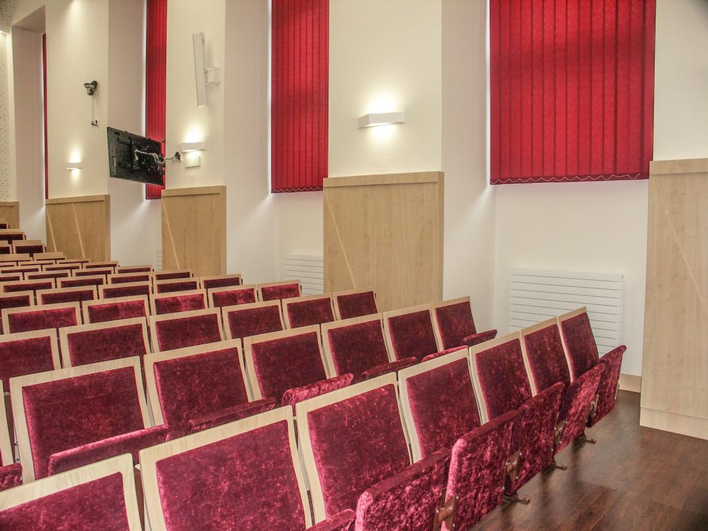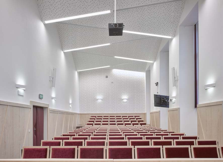 Jednalo se o vybavení Stěžejní prací byla rekonstrukce auly se speciálními akustickými vlastnostmi. Jedná se o zalamující konstrukci opatřenou akustickými deskami. Stojí za povšimnutí i detailů dřevěných obkladů kopírující zalomení stropu.