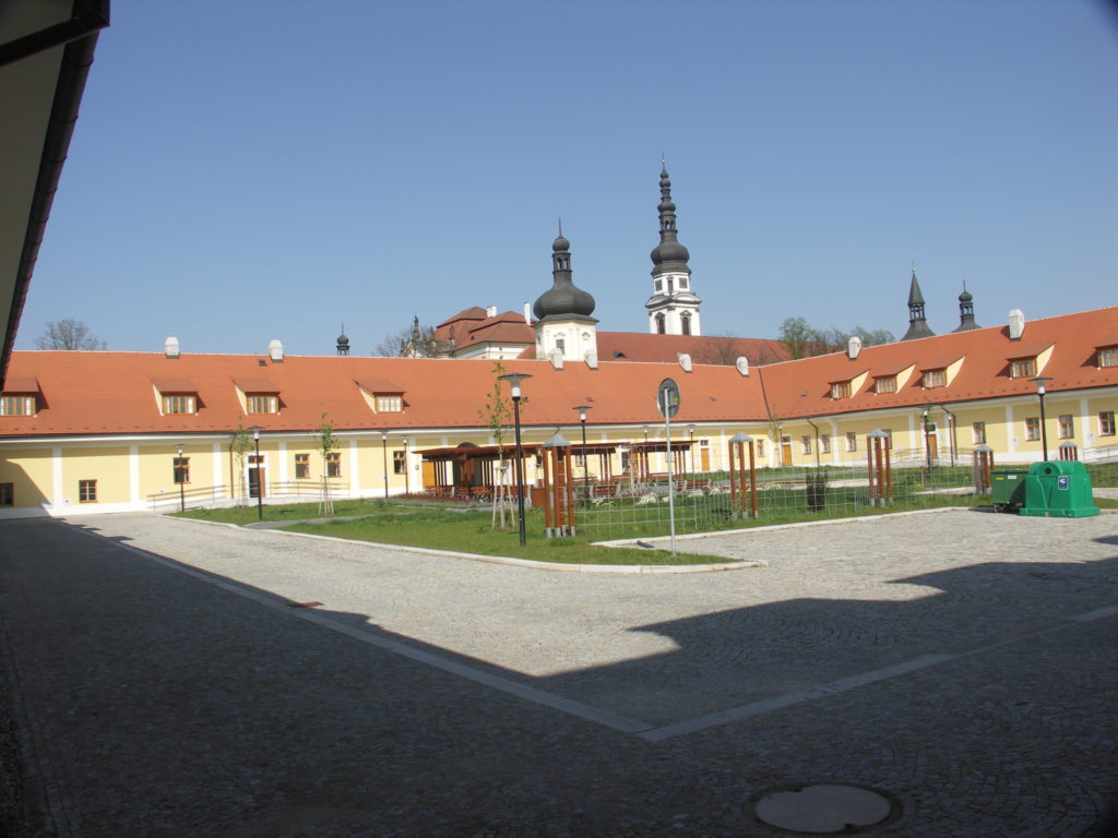 Nádvoří v prostoru hlavního nástupu slouží jako pěší zóna hospitalizovaných nebo ubytovaných klientů, řešení umožňuje občasný provozem zdravotních a jiných servisních vozidel. Povrch odpočinkové plochy nádvoří tvoří povrchy z kamenných dlažeb, které podpoří funkční členění do samostatných úseků zařízení – kamenné desky, pobytové plochy s lavičkami – mlat, hlavní odpočivné plochy – trávník). Střed nádvoří tvoří kruhová zpevněná plocha s altánem, který kříží přístupové chodníky.