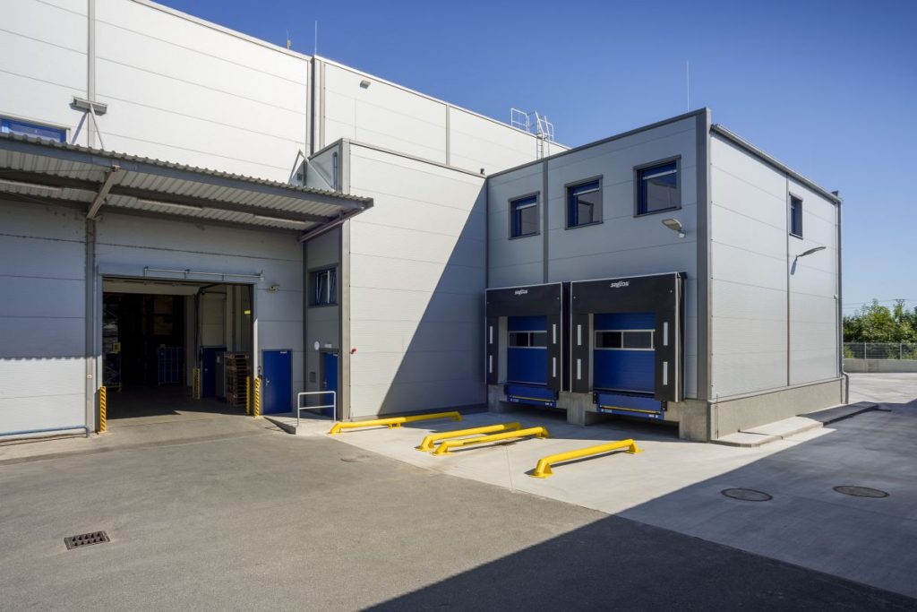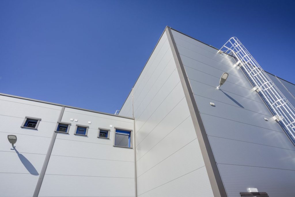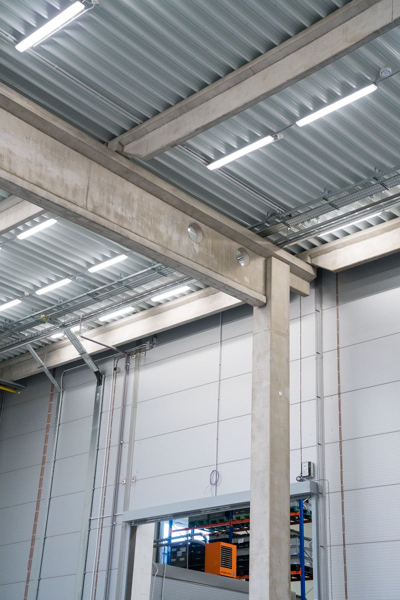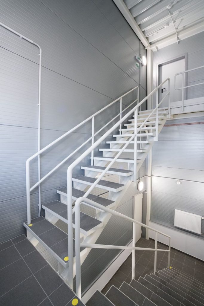 – Складской зал размером 52 x 24 м состоит из сборно-разборной конструкции и сэндвич-панелей. К залу пристроена погрузочная рампа для грузовых автомобилей. Пандус состоит из стальной конструкции, оснащенной системными разборными ячейками, в которых размещаются офисы и помещения для персонала.