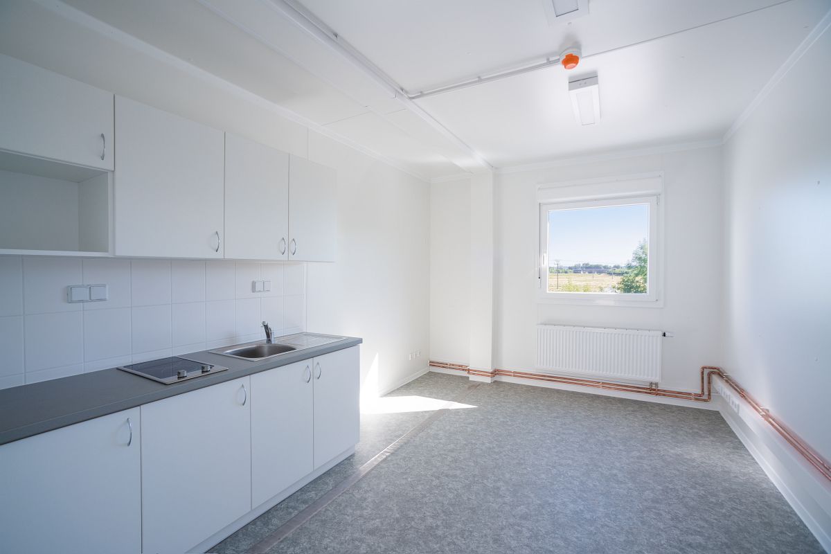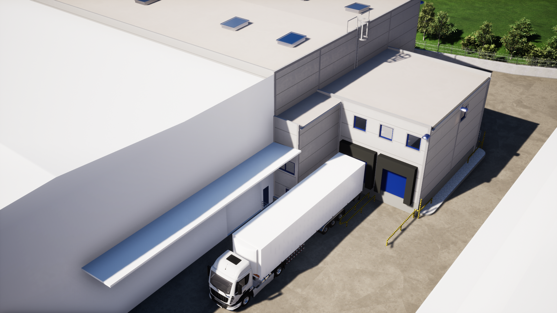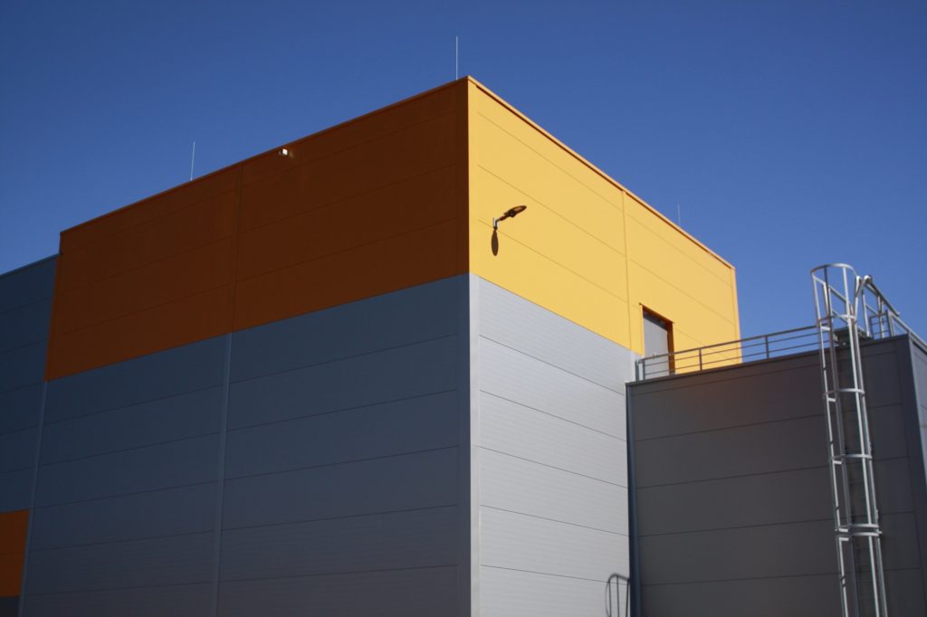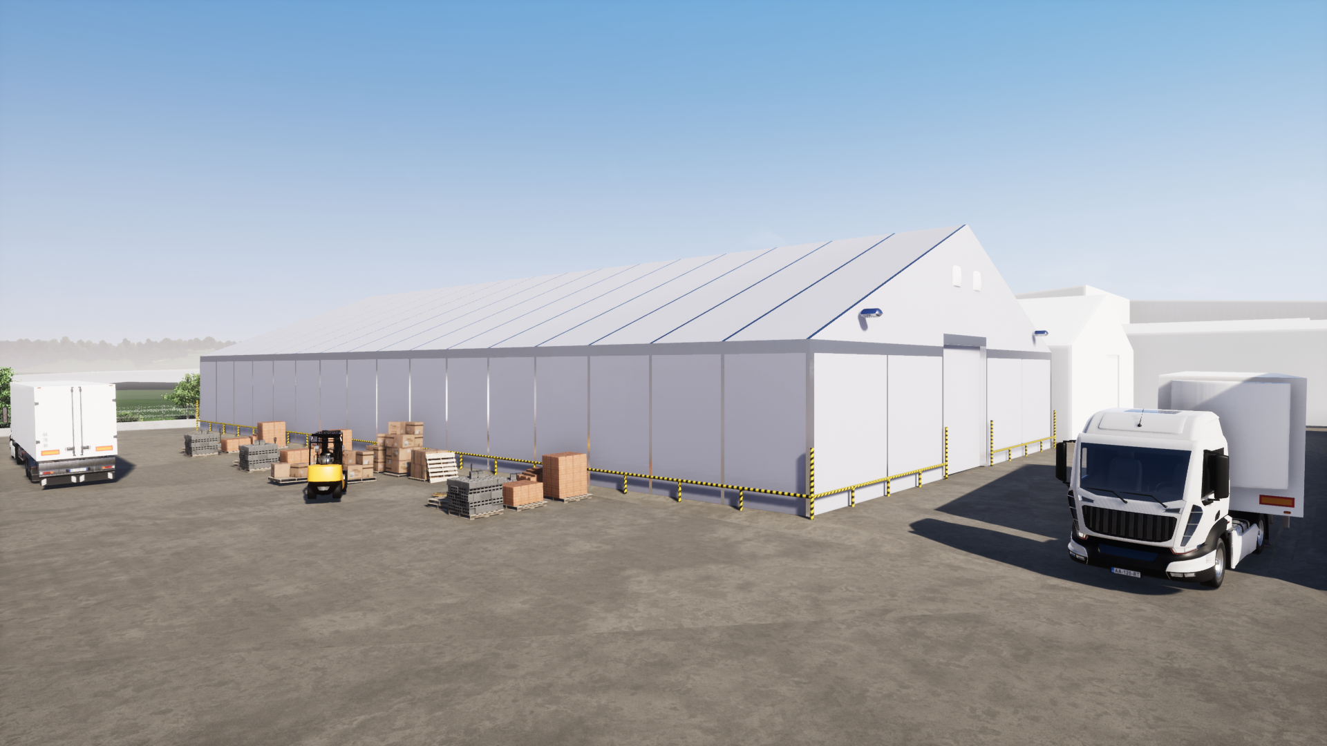 – Складской зал размером 52 x 24 м состоит из сборно-разборной конструкции и сэндвич-панелей. К залу пристроена погрузочная рампа для грузовых автомобилей. Пандус состоит из стальной конструкции, оснащенной системными разборными ячейками, в которых размещаются офисы и помещения для персонала.